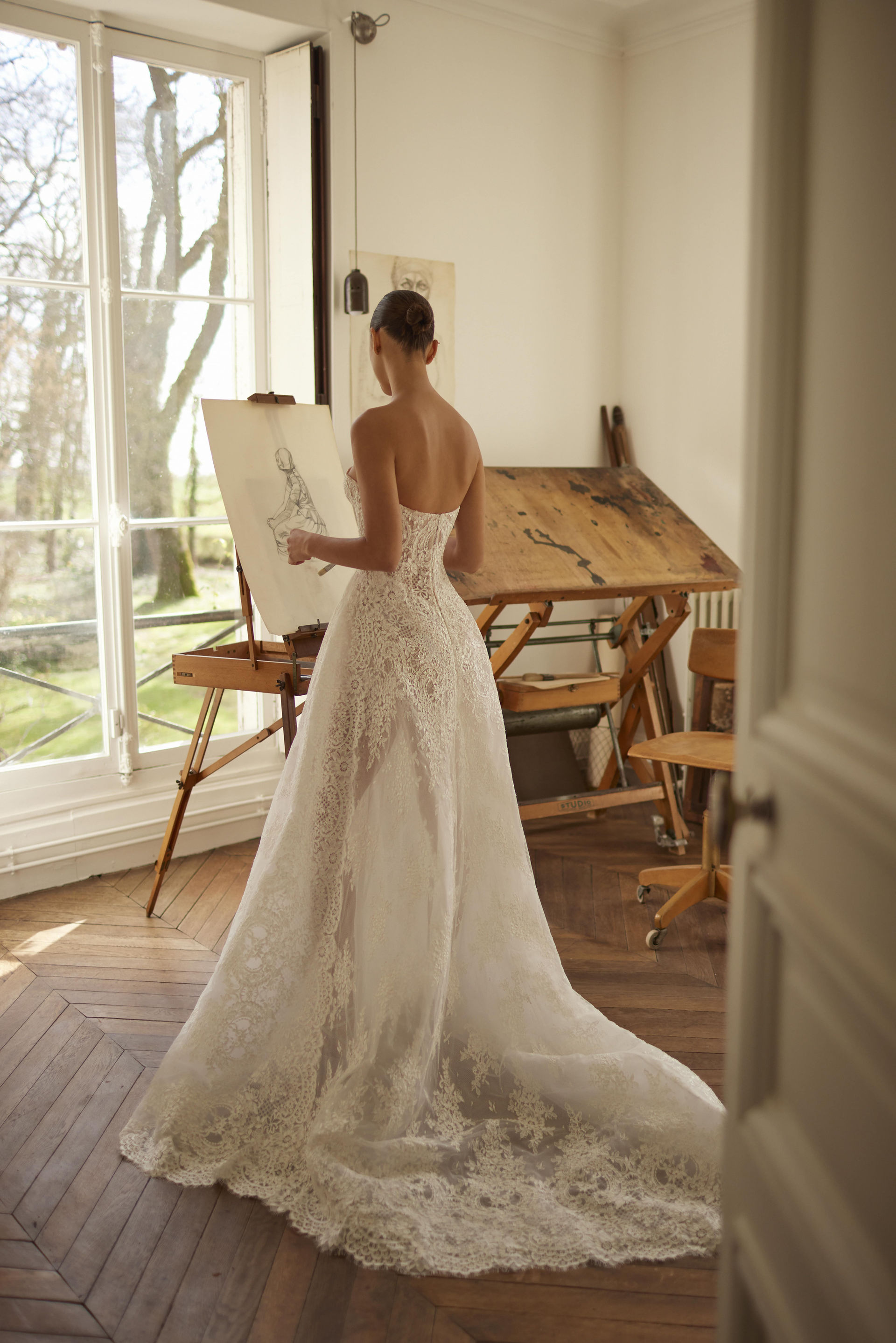 A feminine A-line gown with half circle structured skirt featuring an inner corset bodice made by a layered variety of hand sewn lace applications to create an illusion effect on the body.